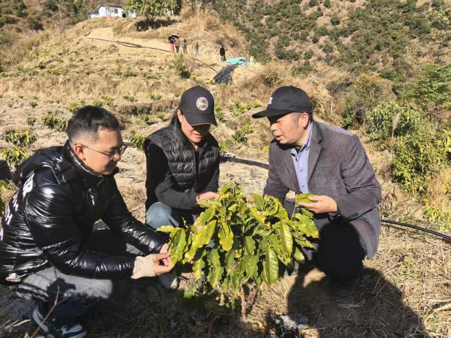 随后,张汉尧教授一行深入啡之梦公司位于怒江龙头山的咖啡种植基地开展实地考察。怒江峡谷独特的高海拔、温差大地理环境,为咖啡种植提供了得天独厚的条件,而龙头山基地作为当地精品咖啡培育与示范核心区,正处于从传统种植向智慧化转型的关键阶段。考察中,张汉尧教授实地查看了基地咖啡长势、现有种植模式及基础设施配套情况,结合怒江咖啡产业发展现状,与基地技术人员、企业负责人围绕智慧果园建设、智能机器人应用、品种精准匹配等关键问题展开深度研讨。